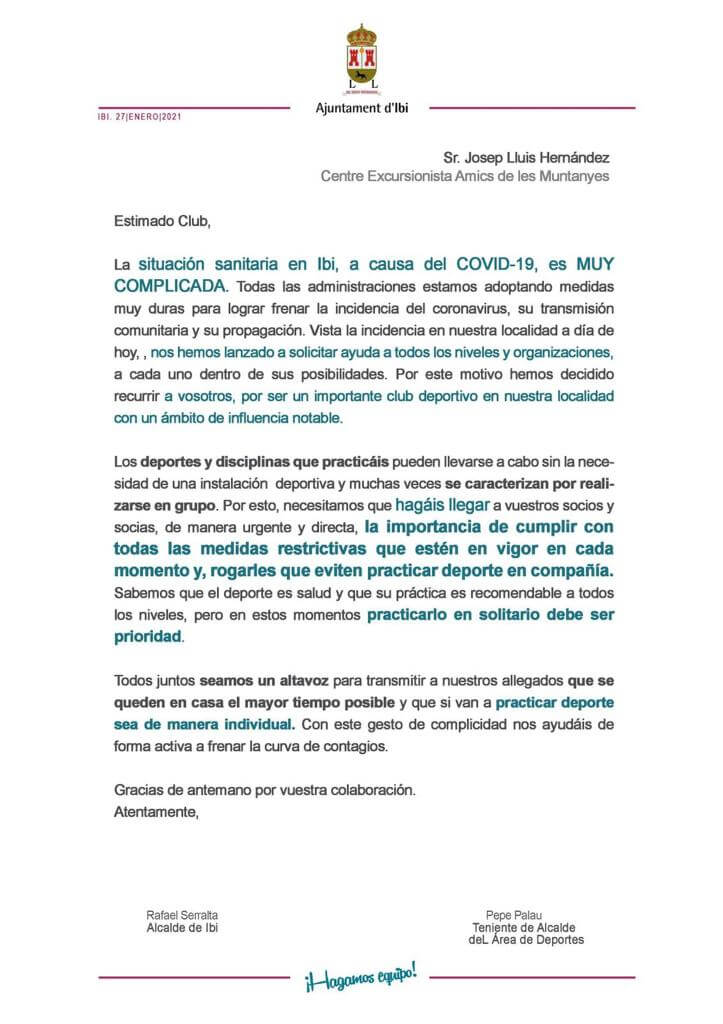 Carta del Ayuntamiento a nuestro club, con motivo de la situación actual, que por el COVID-19, tiene nuestra localidad de Ibi.